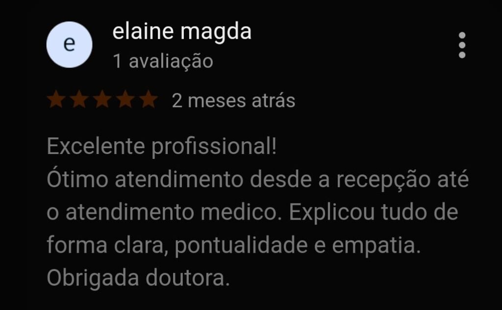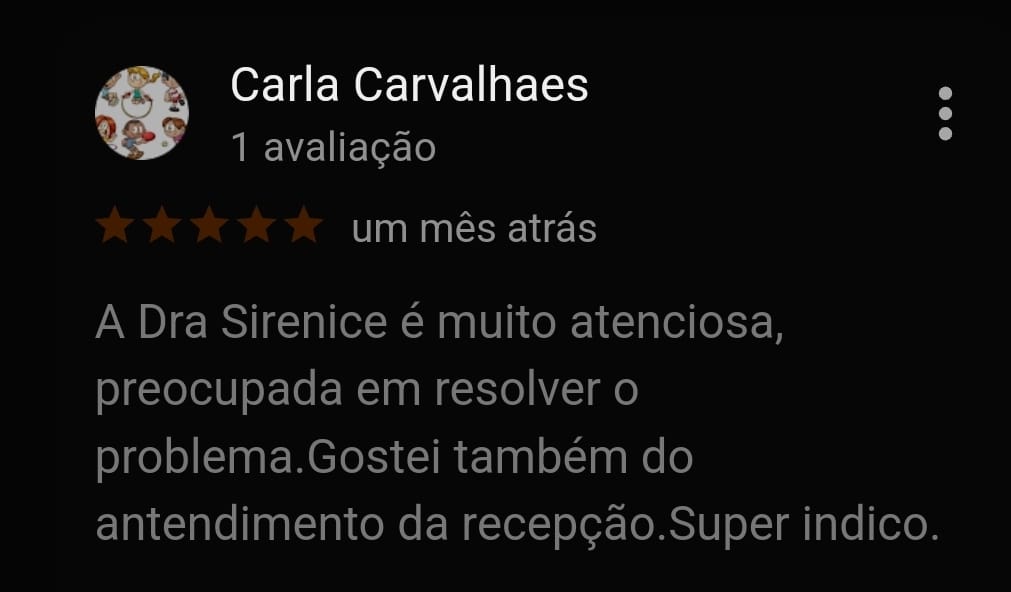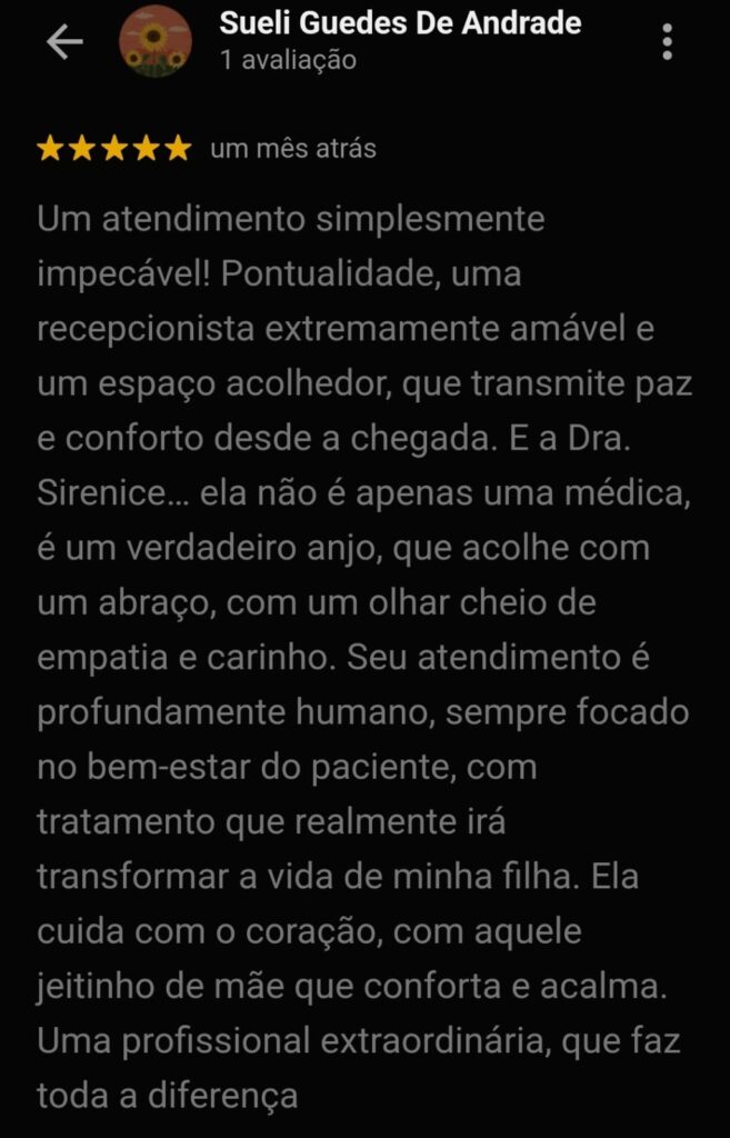 Muitos pacientes deixam avaliações e depoimentos no Google expressando a sua satisfação e carinho pela Dra. Sirenice, reconhecendo a sua dedicação, competência e o cuidado humano que oferece em cada atendimento. Leiam alguns abaixo.